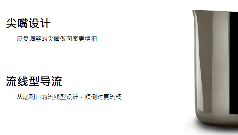 反復(fù)調(diào)整的尖嘴,讓圖案更精細(xì)從底到口的流線型設(shè)計(jì),傾倒時(shí)更流暢