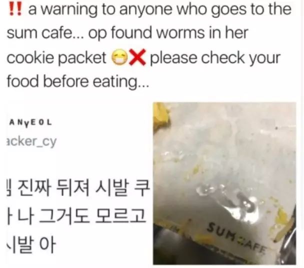 ▲孝淵曾經(jīng)在宣傳片中介紹SM咖啡廳?! ∫幻铺貛ぬ?hào)為Cracker_cy的粉絲日前發(fā)文,開頭就大罵“X的,SM找死嗎?” 原來(lái)是她在SM娛樂開設(shè)的SUM Cafe買了專輯后,收到附贈(zèng)餅干做為禮品,但就在快吃完時(shí)發(fā)現(xiàn)了一條長(zhǎng)長(zhǎng)黃色的蛆,雖然照片看不出是死是活,但也夠驚悚,她寫下:“X的,餅干里面有蟲,我完全不知道都快吃完了,X的!”連飆3次臟話。