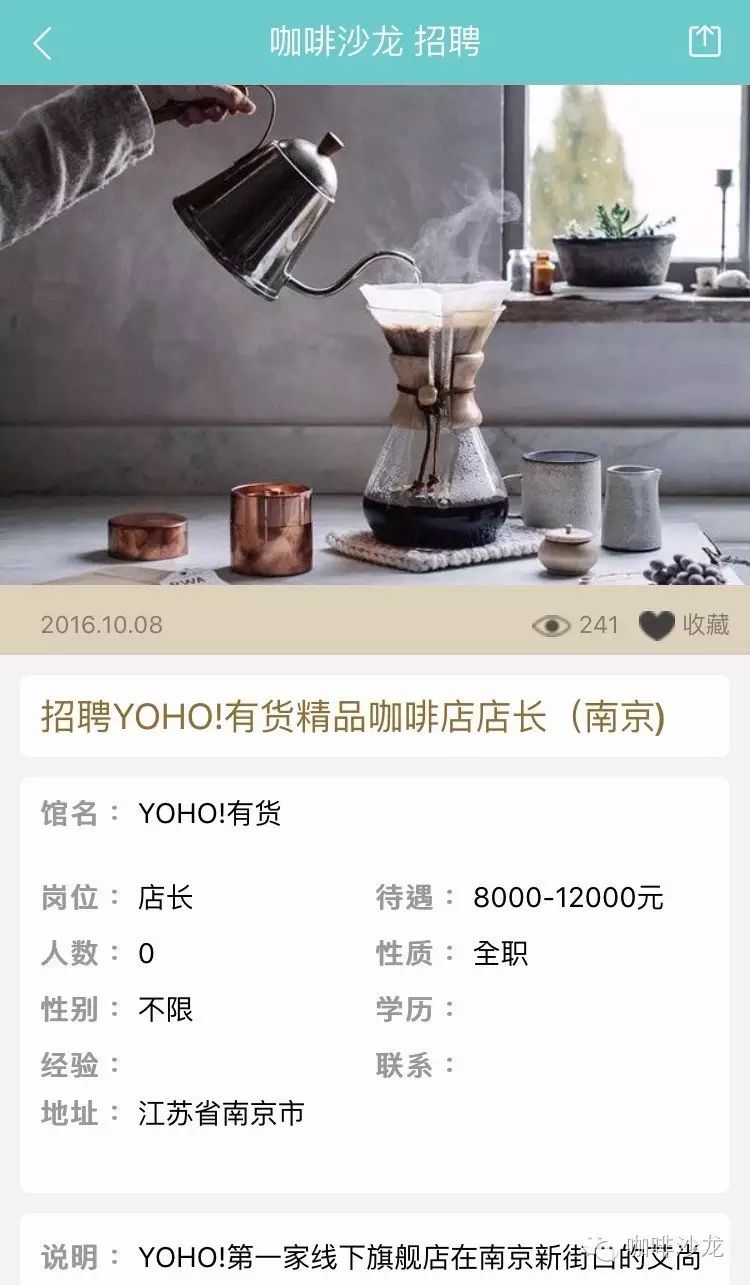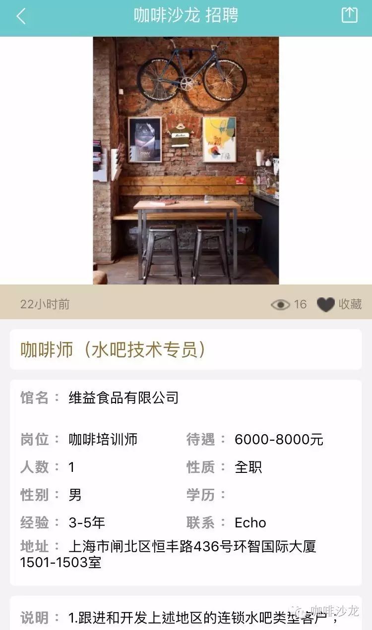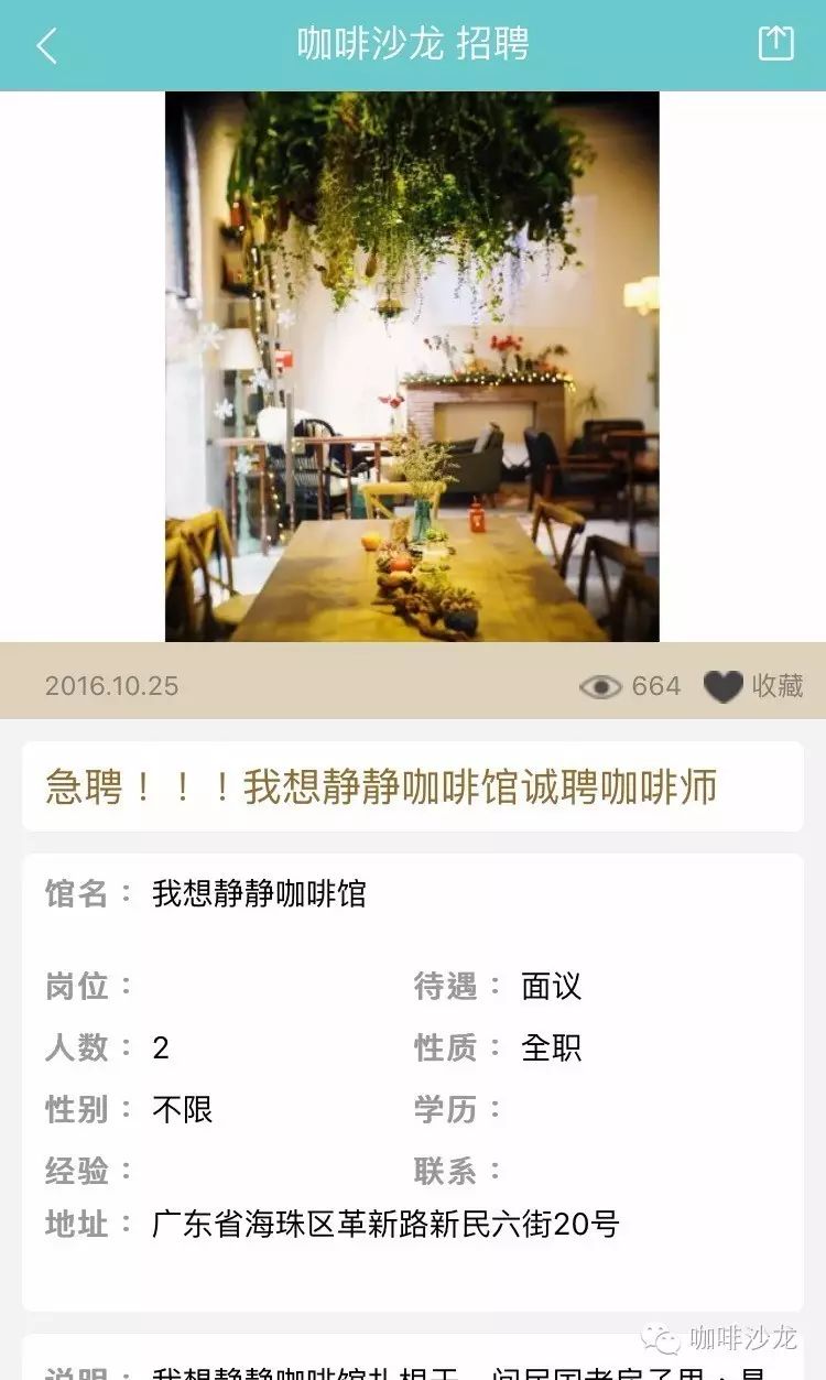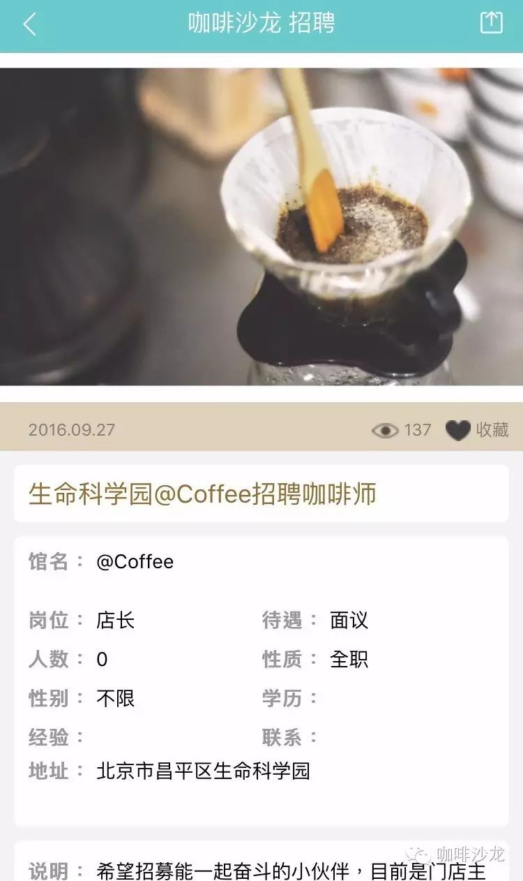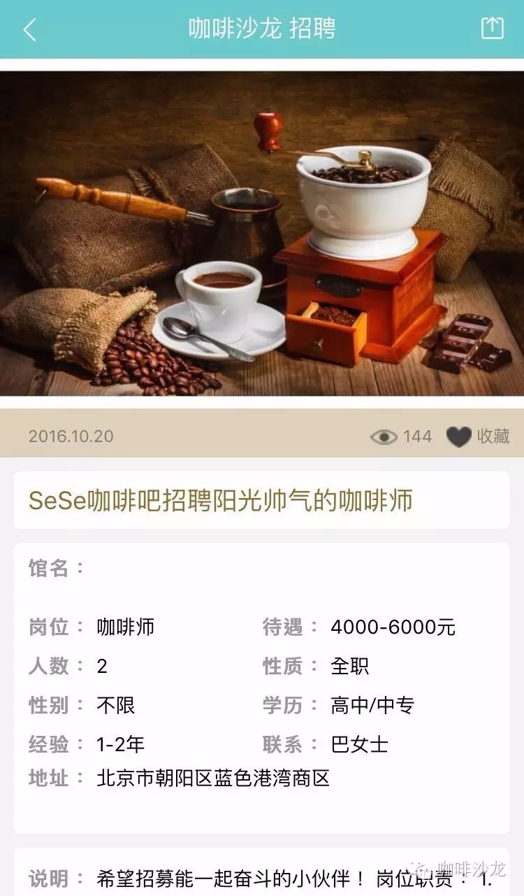 請使用PC端登陸:www.coffeesalon.com/job免費(fèi)發(fā)布!請注意:盡量信息填寫完整,必須要有咖啡館相關(guān)圖片或者LOGO,您的整體形象,也是咖啡師抉擇的依據(jù)!更重要的是不久之后將會推出通過手機(jī)端在平臺上進(jìn)行發(fā)布,讓信息發(fā)布不再多占用你一秒鐘的時(shí)間?。ㄏ肓私獍l(fā)布教程就點(diǎn)我)咖啡館主—伯樂總與千里馬相配只要信息發(fā)布完整,在附上咖啡館的美照,還找不到你心愛的咖啡師嗎,對比以往在自己的身邊甚至是朋友圈中尋找,不如在咖啡沙龍招聘頻道發(fā)布信息更來的簡單粗暴!咖啡師—為夢想尋找廣闊舞臺通過朋友的介紹這種途徑已經(jīng)跟不上時(shí)代了,現(xiàn)在登陸咖啡沙龍招聘頻道找工作更加容易。輻射面更大,渠道更廣,全國各地,只要有招聘信息就可以按要求投遞簡歷,媽媽再也不擔(dān)心我當(dāng)不了咖啡師了!總有一家咖啡館是你的菜!下面是招聘頻道的部分招聘信息: