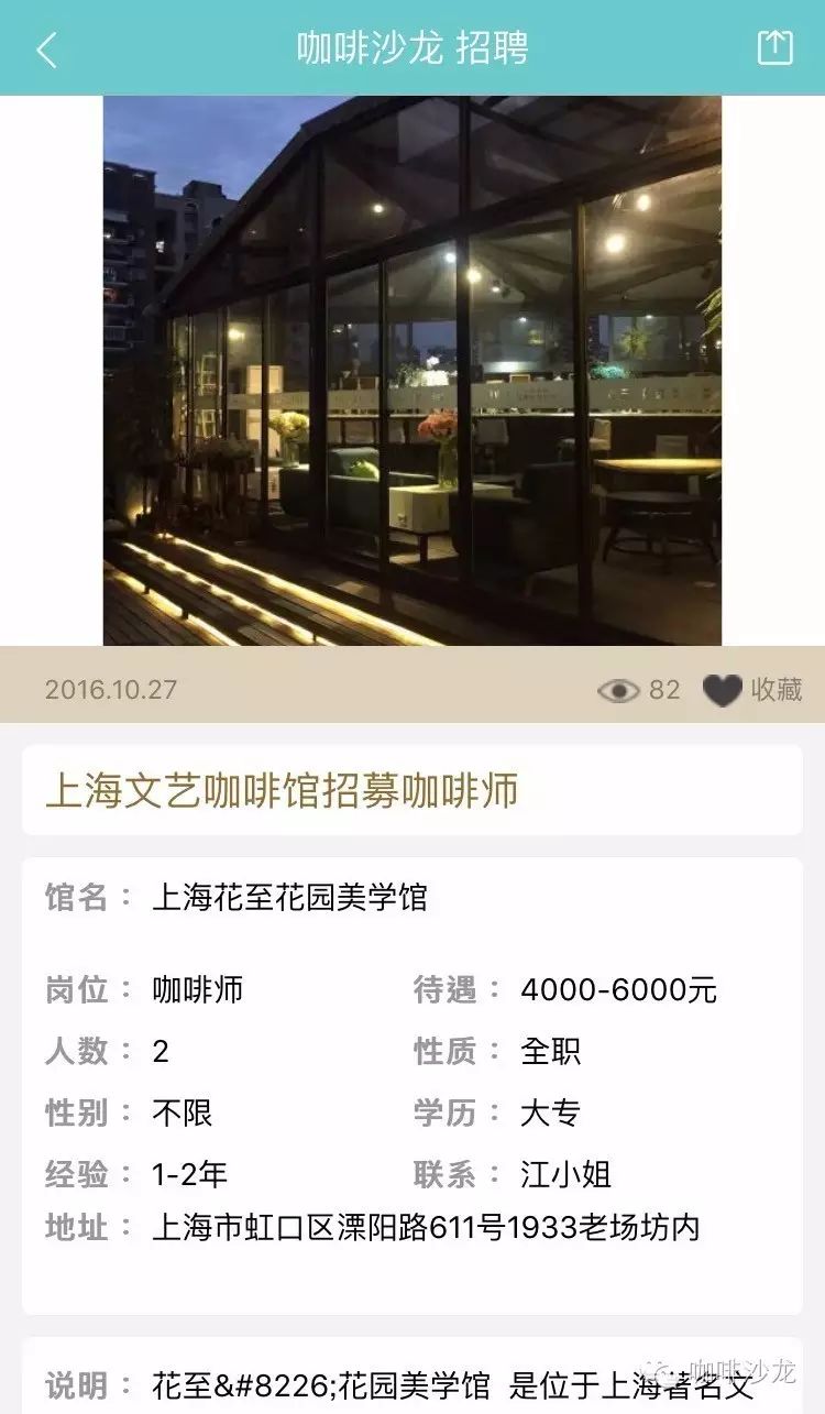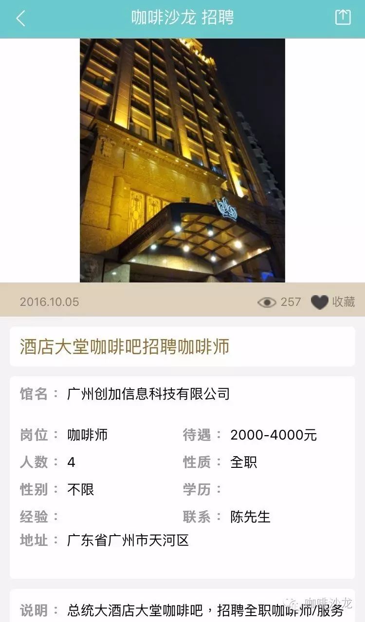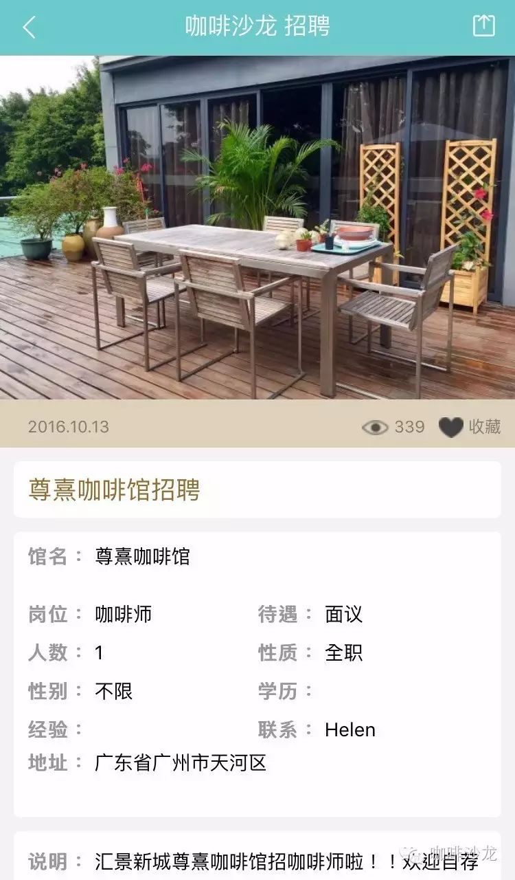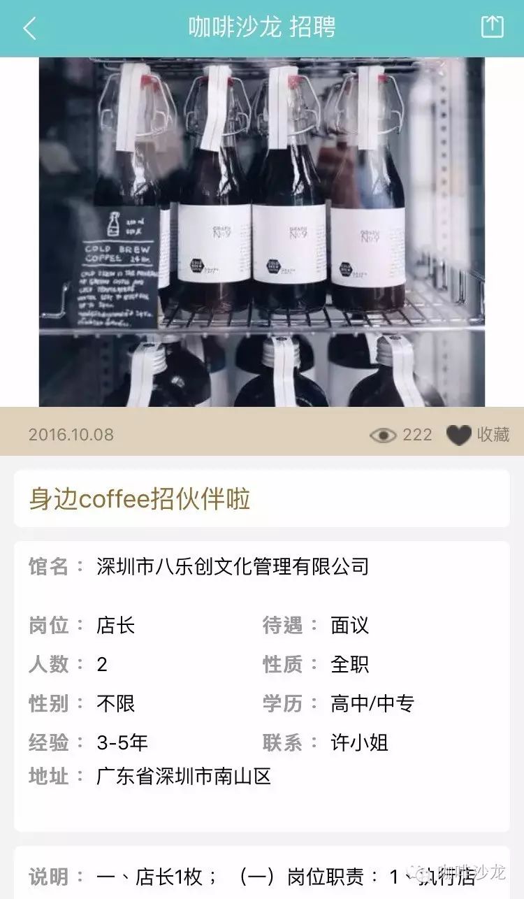 請使用PC端登陸:www.coffeesalon.com/job免費(fèi)發(fā)布!請注意:盡量信息填寫完整,必須要有咖啡館相關(guān)圖片或者LOGO,您的整體形象,也是咖啡師抉擇的依據(jù)!更重要的是不久之后將會推出通過手機(jī)端在平臺上進(jìn)行發(fā)布,讓信息發(fā)布不再多占用你一秒鐘的時(shí)間?。ㄏ肓私獍l(fā)布教程就點(diǎn)我)咖啡館主—伯樂總與千里馬相配只要信息發(fā)布完整,在附上咖啡館的美照,還找不到你心愛的咖啡師嗎,對比以往在自己的身邊甚至是朋友圈中尋找,不如在咖啡沙龍招聘頻道發(fā)布信息更來的簡單粗暴!咖啡師—為夢想尋找廣闊舞臺通過朋友的介紹這種途徑已經(jīng)跟不上時(shí)代了,現(xiàn)在登陸咖啡沙龍招聘頻道找工作更加容易。輻射面更大,渠道更廣,全國各地,只要有招聘信息就可以按要求投遞簡歷,媽媽再也不擔(dān)心我當(dāng)不了咖啡師了!總有一家咖啡館是你的菜!下面是招聘頻道的部分招聘信息:
