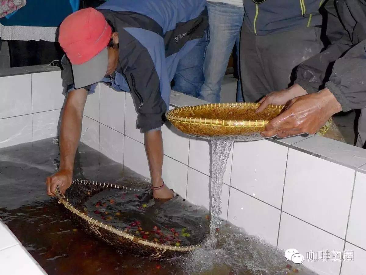 1、咖啡果去皮,將帶殼豆置入裝水的大桶或水槽,撈除飄浮于液面的瑕疵帶殼豆。