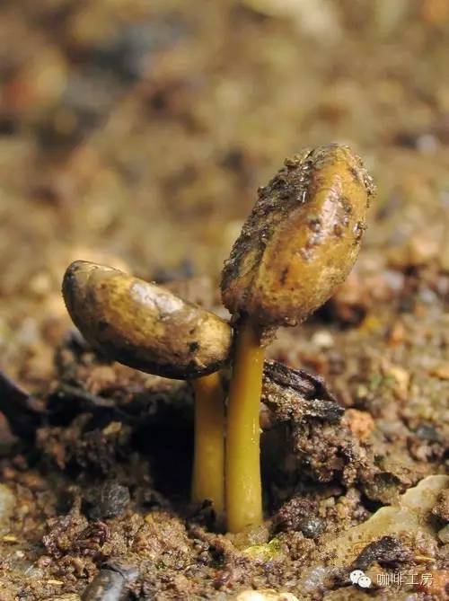 ?。ㄒ唬?幼苗期 幼苗期是從種子(或插條、嫁接)發(fā)芽到苗木出圃的一段時期(苗圃育苗的階段),大約0.5-1.5年的時間。在咖啡種子播種后,經(jīng)過一段時間的萌發(fā)過程后子葉開始出土,大約要經(jīng)過30-100天,其時間的長度與溫度和濕度有很大的相關(guān)性。萌發(fā)后須將子葉苗移到營養(yǎng)袋中育苗,需要3-12個月方可出圃。