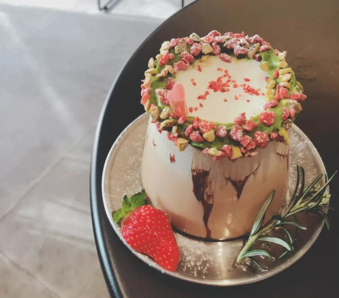 深圳一家蛋糕店,花語(yǔ)杯系列推出了鮮花飲品,草莓、葡萄、芒果、牛油果4款飲品上面對(duì)應(yīng)了與水果茶顏色相應(yīng)的鮮花,把一杯飲品打造成了“賞花品茶”的景觀飲品。(啰嗦一句:用到非食材物料要特別注意食品安全。)