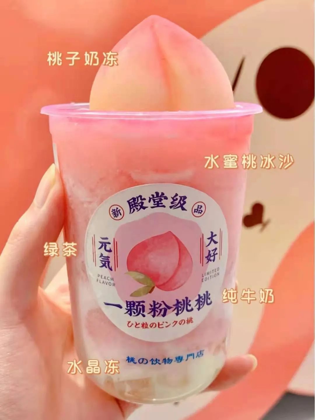 樂(lè)樂(lè)茶在剛剛過(guò)去的地球日也推出了新品地球酪酪,采用的是藍(lán)莓+牛油果+酸奶+燕麥奶的搭配,像是把地球的“青山綠水”“藍(lán)天白云”裝入杯中。2. 更“夸張”的水果表達(dá),比如用奶凍做水蜜桃大家都在賣水果茶,我發(fā)現(xiàn)水果茶更加極致的賣法:直接“造景”造出水果的樣子。不久前,和氣桃桃就新推出了一款以假亂真的桃子飲品:一顆粉桃桃,他們的做法就是在飲品頂部加了一顆奶凍做的“水蜜桃”,下面是水果冰沙、桃子果肉、牛奶、茉莉花茶底,售價(jià)28元。