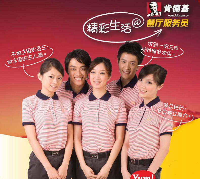 最近幾年,不知是不是受了“我為自己代言”這句話的鼓動(dòng),越來越多的企業(yè)將自己?jiǎn)T工的肖像放上了各大雜志、官方網(wǎng)站、甚至是招聘廣告,而這些員工往往不再是老板或者高管,也不斷的向基層服務(wù)員發(fā)展。對(duì)于老板來講,一方面不用高昂的費(fèi)用請(qǐng)模特就能拍出照片,另一方面也能提升員工的自豪感。這種方法將給應(yīng)聘者造成一個(gè)心理印象:即這家企業(yè)很看重員工。(代表企業(yè):KFC)