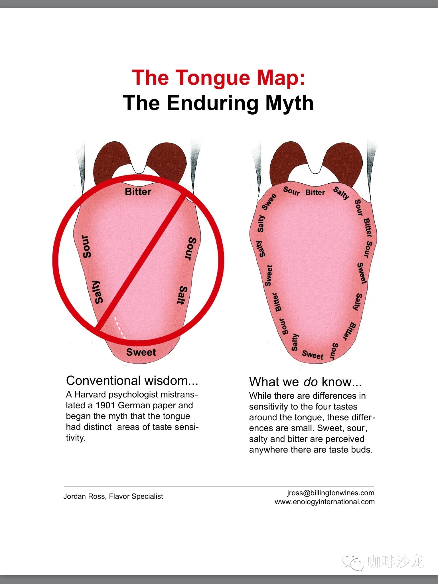 上圖:左)錯誤的舌頭味蕾區(qū) | 右)正確應是舌頭每個區(qū)域都能感受酸甜苦咸