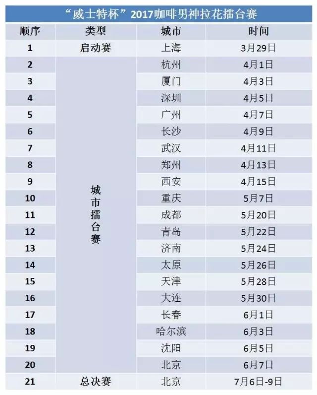 城市擂臺(tái)賽的具體比賽時(shí)間段和地點(diǎn),我們接下來(lái)通過(guò)“咖啡精品生活”公眾號(hào)陸續(xù)公布,敬請(qǐng)留意;啟動(dòng)賽是3月29日下午13:00-16:00在上海新國(guó)際博覽中心E5館 5D18 宏達(dá)正品展位(2017HOTELEX上海國(guó)際酒店用品博覽會(huì) 現(xiàn)場(chǎng))舉行,總決賽是7月6日-9日在中國(guó)國(guó)際展覽中心 中國(guó)國(guó)際咖啡展(Cafe Show)現(xiàn)場(chǎng)舉行。