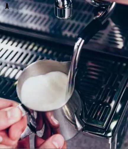 ⑤加大蒸汽送氣量,把蒸汽棒的尖端拉到牛奶表面,除了奶液攪動的噪音,還應(yīng)能聽到尖銳的“爆裂聲”。此時應(yīng)該看不見任何的大氣泡。⑥繼續(xù)旋轉(zhuǎn)牛奶并打泡。一旦到了40℃,可自由流動的脂肪會來搗亂,牛奶就很難打得動了。⑦把蒸汽棒深插進牛奶,左手繼續(xù)保持旋轉(zhuǎn),一直進行到65℃(圖B)。