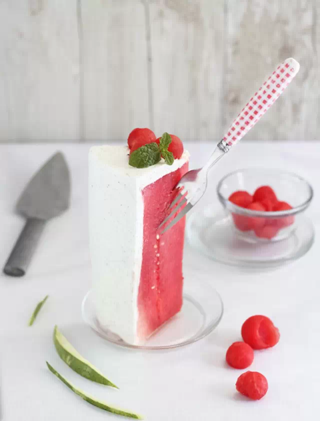 你沒(méi)有想過(guò)的西瓜新吃法 — 免烤 “西瓜蛋糕”如果你也超愛(ài)西瓜,那么這個(gè)夏天不妨試做一下這款貨真價(jià)實(shí)的“西瓜蛋糕”!沒(méi)有烘焙功底,也沒(méi)有烤箱?沒(méi)關(guān)系,因?yàn)槟愀静恍枰鰺┧廊说钠蒿L(fēng)蛋糕底,只要把整個(gè)西瓜去皮,涂抹上奶油,然后用鮮果或者果仁裝飾就完成了,清爽多汁,尤其適合不開(kāi)胃、怕肥膩重口味的大熱天。制作方法: