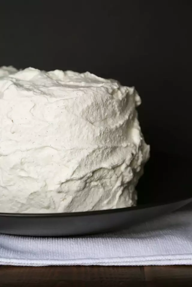Step 4:四周涂抹好后,記得頂部也一定要抹平。涂完奶油后你會(huì)覺(jué)得不像外面西餅店賣(mài)的蛋糕那樣平整,尤其是當(dāng)奶油稍稍有點(diǎn)打發(fā)過(guò)頭,質(zhì)地變得有點(diǎn)粗糙時(shí),但沒(méi)關(guān)係,裝飾之后就會(huì)好很多,而且比較有手作的感覺(jué)。
