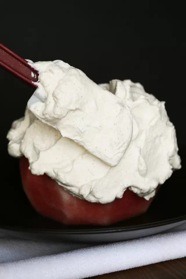 Step 2:從冰箱拿出鮮奶油,加糖和幾滴香草精,或者是香草籽打發(fā)至不流動(dòng)的狀態(tài),千萬(wàn)不要打過(guò)頭了。*鮮奶油和糖的比例為100: 8,如果西瓜比較大,鮮奶油可以多放,用不完的可以用保鮮膜對(duì)上放進(jìn)冰箱冷藏保存。