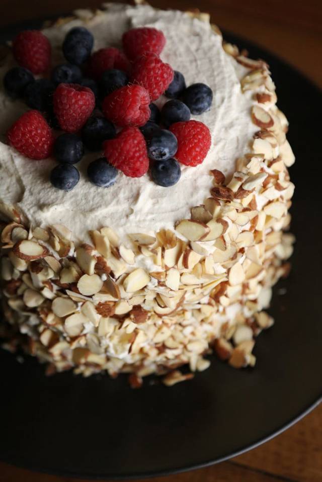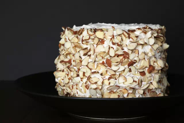 Step 5:用無(wú)鹽的烤杏仁片來(lái)裝飾“蛋糕”四周。*這里會(huì)需要多給點(diǎn)耐心,否則杏仁可能會(huì)過(guò)密,也可能會(huì)黏不穩(wěn)。