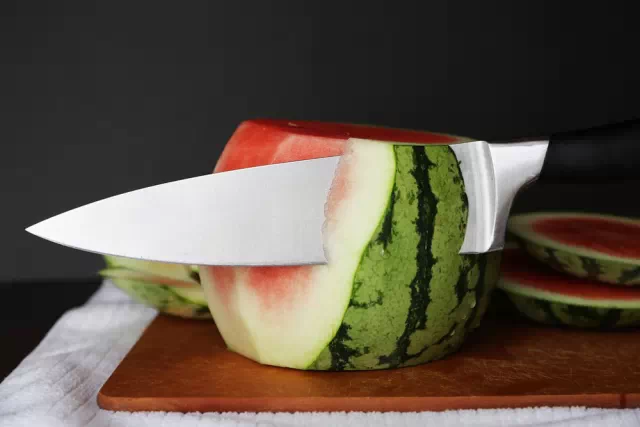 Step 1:西瓜去頭去尾,立起來(lái)將皮切掉,去皮完畢后用廚房紙將西瓜外部的水分擦干,這個(gè)動(dòng)作可以方便后面涂抹奶油,然后轉(zhuǎn)移到你打算用來(lái)放西瓜蛋糕的容器中準(zhǔn)備裝飾。