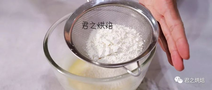 低筋面粉過篩,篩入黃油蛋清糊里。