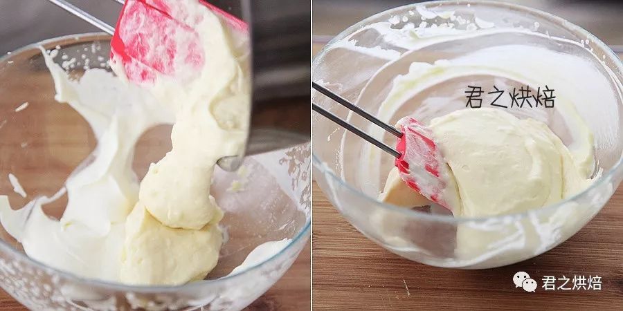 拌好以后的卡仕達醬倒回淡奶油碗里,用刮刀翻拌均勻。完全拌勻以后就是香草奶油醬了。