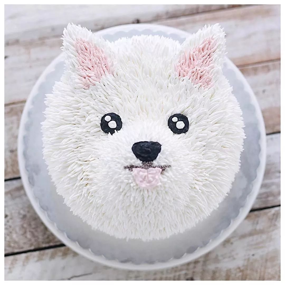 狗狗蛋糕最有意思的地方,是用奶油霜制作出毛絨絨的效果。哪怕是相同品種的狗,神色也是不同的。Ivenoven把狗子的氣質(zhì)神還原到蛋糕上,讓狗狗主人一看就能認(rèn)出來(lái)——“這就是我家狗子??!”?狗狗憨臉蛋糕Ivenoven做得最多的毛絨狗狗蛋糕,就是這種只有狗狗肉乎乎臉蛋的圓形蛋糕。水靈靈的大眼睛,黝黑的鼻頭,有的還吐著粉撲撲的小舌頭。