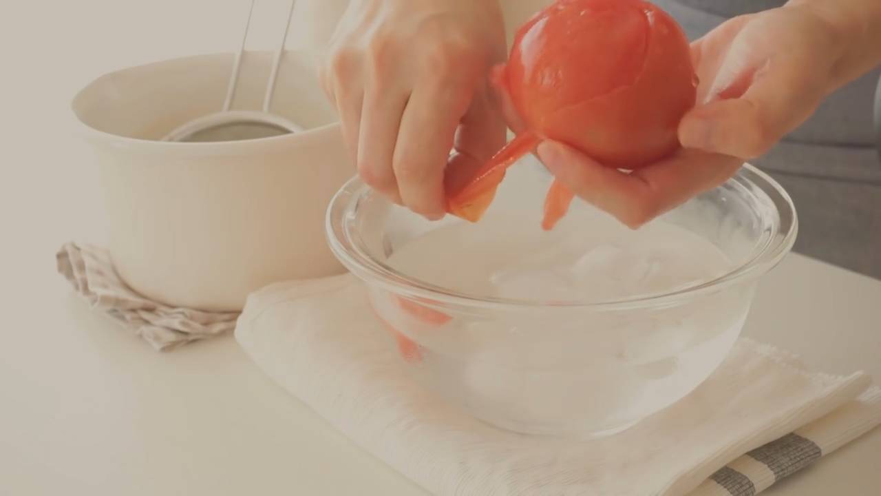 披薩醬:①番茄表面切十字,用開水燙3分鐘,取出放入冰水中,剝去番茄皮